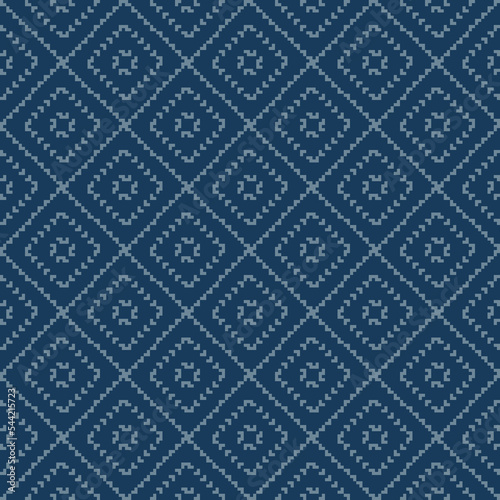 Vector geometric traditional folk ornament. Modern ethnic style seamless pattern. Ornamental geo background with floral shapes, squares, grid. Texture of embroidery, knitting. Dark blue color