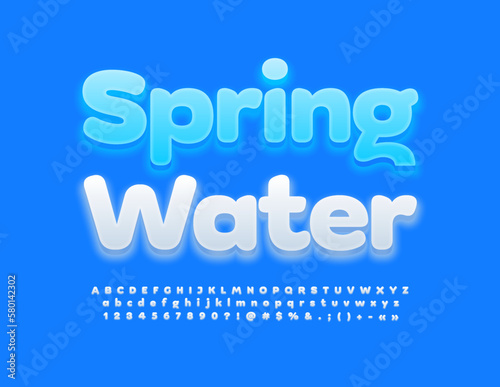Vector glowing Emblem Spring Water. Creative White Font. Modern Alphabet Letters and Numbers set