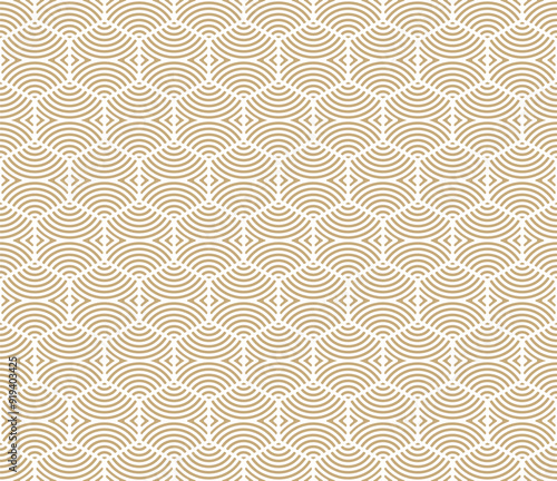 Vector golden abstract geometric pattern with hexagon shapes, curved lines, stripes, waves, grid. Gold and white texture. Stylish modern luxury background. Simple repeating geo design for decor, print