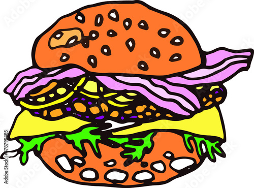 Vector hand drawn burgers and snacks objects, drawn fast food elements, sandwiches, street food, a sandwich with bacon and cheese, colored doodle, colored burger