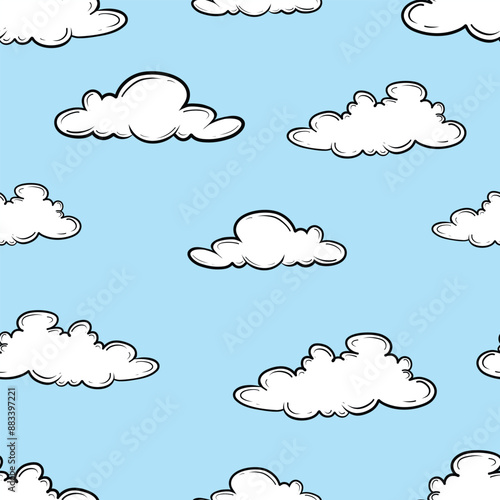 Vector Hand Drawn Clouds Seamless Pattern. Cartoon clouds repeatable texture in retro style. Clouds Set in Hand Drawn Vintage Retro Style Clouds Pattern for print, wrapper, fabric textile, web uses.