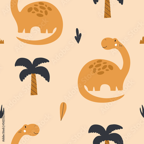 Vector hand drawn colorful seamless repeat baby pattern with cute dinosaurs and scandinavian style textures for nursery and textile decoration.