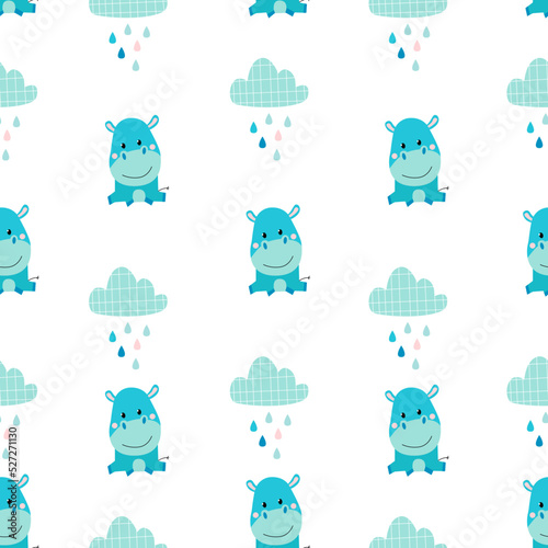 Vector hand drawn cute baby pattern. Hippo, clouds and raindrops in doodle style. Print for clothes, textiles, wallpapers.