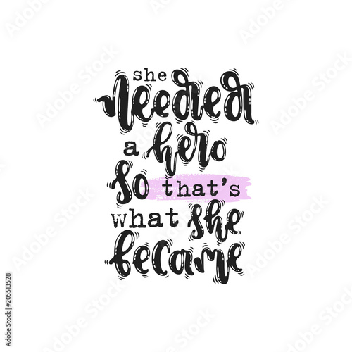 Vector hand drawn illustration. Lettering, She needed a hero so that's what she became, feminism. Idea for postcard, poster.