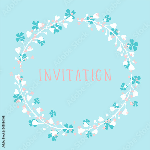 Vector hand drawn illustration of text INVITATION and floral round frame on blue background. Colorful.