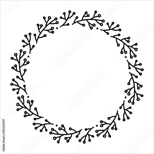 Vector hand drawn spring wreath isolated on white background. Outline circle of leaves. Doodle style. Floral frame.