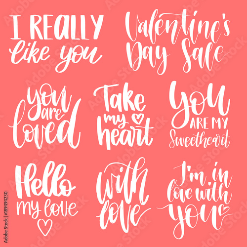 Vector hand lettering phrases Take My Heart, Hugs And Kisses etc. February 14 calligraphy set. Valentines day typography