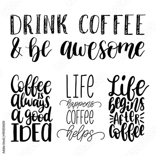 Vector handwritten coffee phrases set. Quotes typography. Calligraphy illustrations for restaurant poster, cafe label.