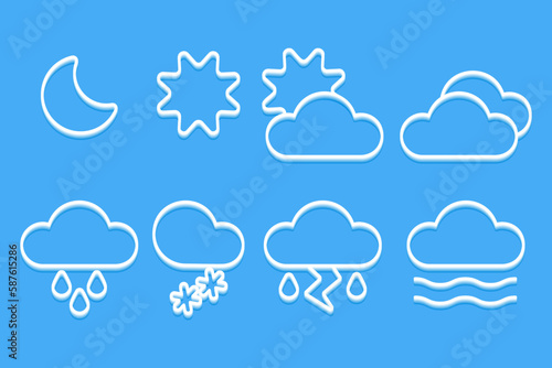 Vector icon collection for weather forecast reports, featuring clean and simple icons for sunny, rainy, cloudy, snowy, and overcast days. Perfect for use in weather apps, websites, widgets for web