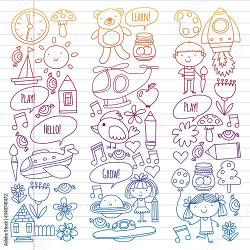 Vector icons and elements. Kindergarten, toys. Little children play, learn, grow together.