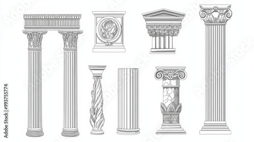 Vector icons depicting ancient Greek and Roman architecture, including line art illustrations of marble pillars, columns, and ornate cornices.