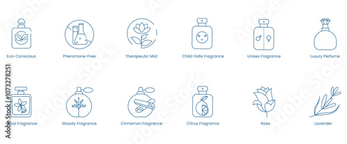 Vector Icons for Eco-Conscious, Pheromone-Free, Therapeutic Mist, Child-Safe Fragrance, Unisex Fragrance, Luxury Perfume, Floral, Woody, Cinnamon, Citrus, Rose, and Lavender Fragrances