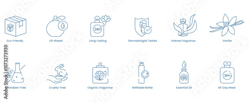 Vector Icons for Eco-Friendly, Oil-Based, Long-Lasting, Dermatologist-Tested, Intense Fragrance, Vanilla, Paraben-Free, Cruelty-Free, Organic Fragrance, Refillable Bottle, Essential Oil