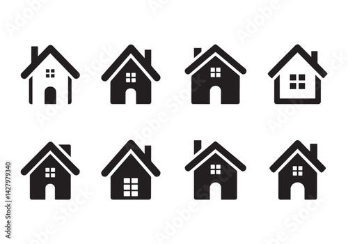 Vector icons of homes with varying roof shapes and styles in simple black silhouettes and outlines