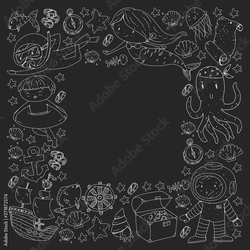 Vector icons of sea ocean adventure for little children. Nautical pattern for kids. Whale, pirates, pirate map, treasure chest, diving and fishes.