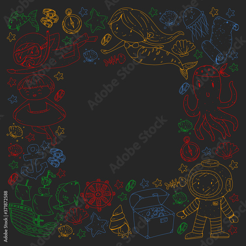 Vector icons of sea ocean adventure for little children. Nautical pattern for kids. Whale, pirates, pirate map, treasure chest, diving and fishes.