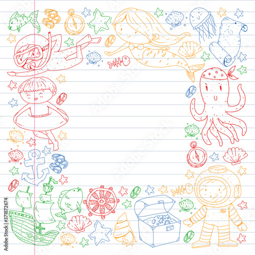 Vector icons of sea ocean adventure for little children. Nautical pattern for kids. Whale, pirates, pirate map, treasure chest, diving and fishes.