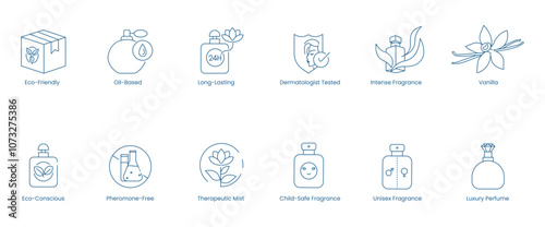 Vector Icons Representing Eco-Friendly, Oil-Based, Long-Lasting, Dermatologist-Tested, Intense Fragrance, Vanilla, Eco-Conscious, Pheromone-Free, Therapeutic Mist, Child-Safe Fragrance