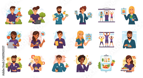 Vector Icons Set of diverse cartoon characters illustrating healthy lifestyle nutrition and fitness concepts. EPS Editable