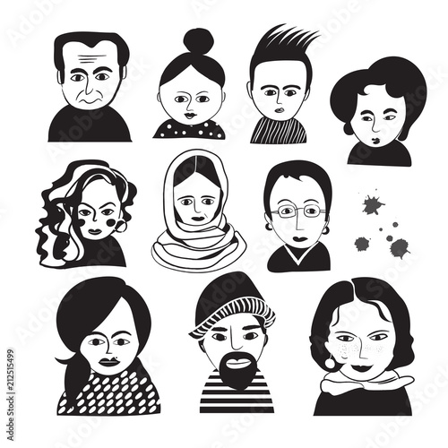 vector illustrated people faces. crowd avatar collection. man woman boy girl. hairstyles beauty hipster glasses. hand drawn sketch. stylish arty unusual.