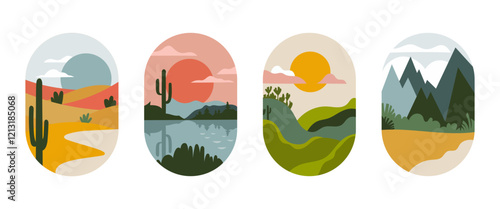 Vector illustration. Abstract mini-landscapes in vertical oval shapes. The colors are green, blue, orange. Natural motifs mountains, trees, sun.