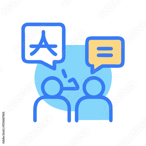 Vector illustration depicting two people communicating in different languages, promoting translation and understanding