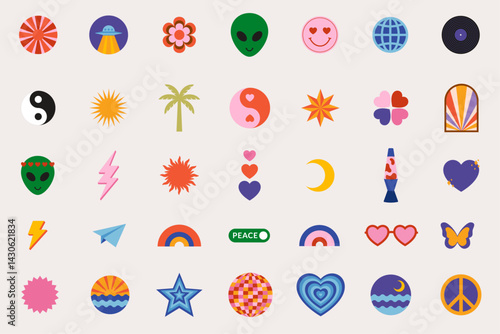 vector illustration, hippie retro clipart, groovy colorful 60s, 70s illustrations