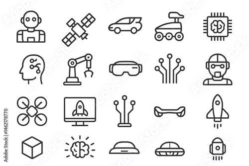 Vector illustration icons representing various aspects of technology, innovation, and robotics in modern society