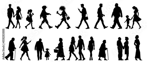 Vector illustration. Large set of black silhouettes of people. People are walking.