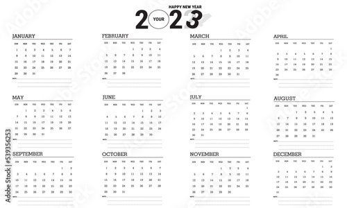 Vector illustration of 2023 calendar year. Black and white calendar design. Eps10 Vector