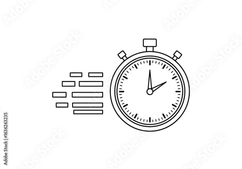 Vector illustration of a black and white illustration of a stopwatch with motion lines, symbolizing speed and time, isolated on a white background