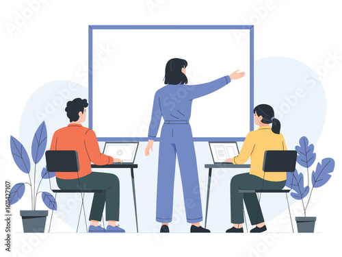 Vector illustration of a business presentation with a woman presenting to two colleagues in a modern office
