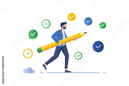 vector illustration of a businessman carrying a pencil symbolizing goal setting and task completion.