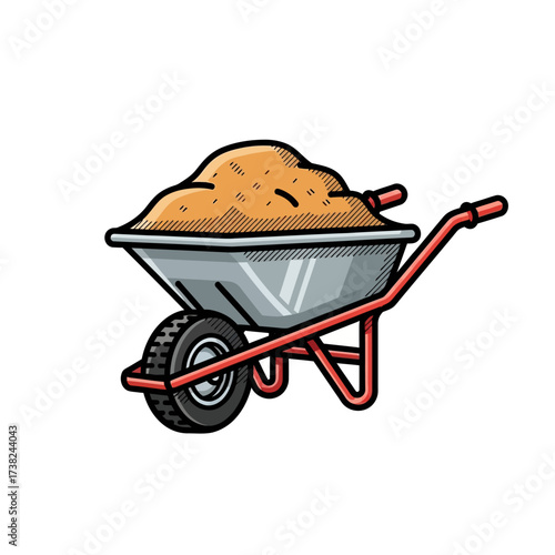 Vector illustration of a classic red and grey wheelbarrow filled with sand, a symbol of construction work and DIY home gardening projects