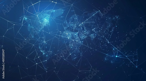 Vector illustration of a futuristic world map symbolizing global social networks and technological advancements, set against a blue plexus geometric background.