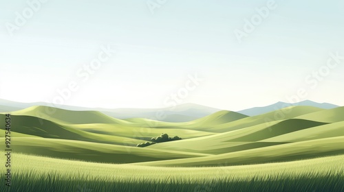Vector illustration of a lush green field on rolling small hills with clear skies. A serene rural scenery landscape showcasing meadows, grasslands, and pastures in a countryside panorama.