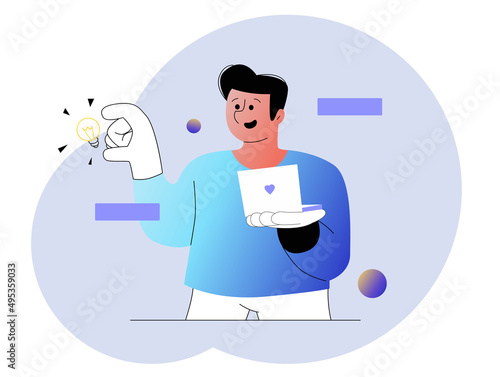 Vector illustration of a man holding a laptop and a light bulb