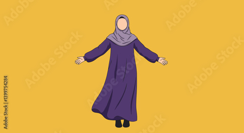 Vector Illustration of a Muslim Woman Wearing a Purple Dress and Hijab on a Yellow Background