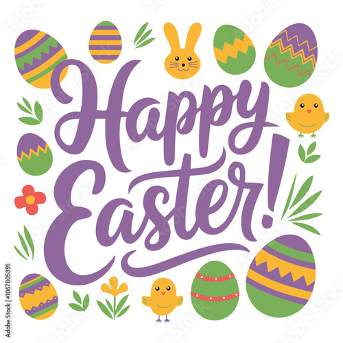 Vector illustration of a purple calligraphy text lettering Happy Easter with eggs and animals on a white background