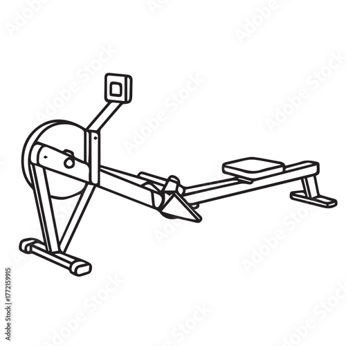 Vector illustration of a rowing exercise machine inside a gym, drawn in monochrome black and white style, emphasizing balance, fitness, and modern gym equipment.