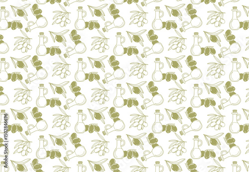 Vector illustration of a seamless pattern with olive oil bottles, olive branches and olives. The design uses earthy green tones on a white background, perfect for a culinary theme.