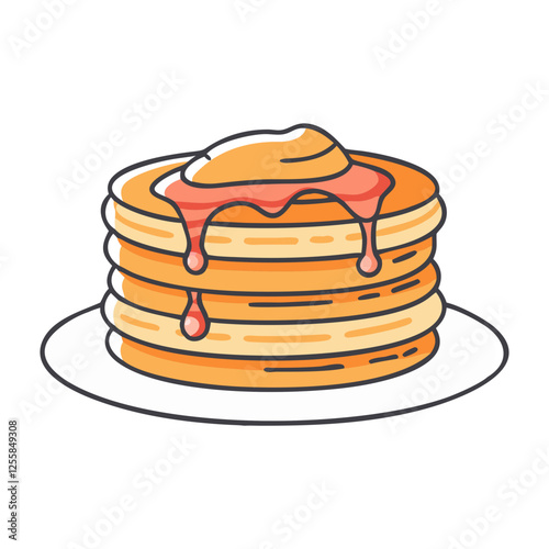 Vector illustration of a stack of pancakes with syrup and butter, A fun vector illustration of a stack of pancakes with syrup and melting butter on top, served on a plate.