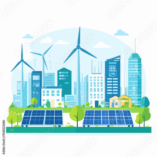 Vector Illustration of a Sustainable Cityscape with Wind Turbines Solar Panels and Green Trees Against a Bright Sky