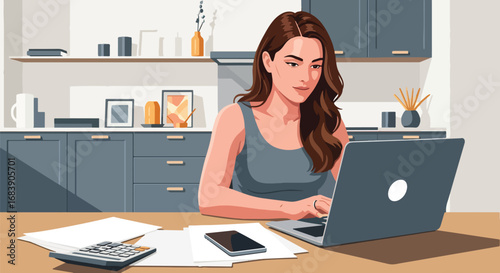 Vector illustration of a woman working on a laptop at home office desk with papers, smartphone, and calculator, symbolizing remote work, productivity, and modern business lifestyle