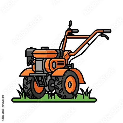 Vector illustration of an orange two-wheel tractor or motor cultivator sitting on a patch of green grass.