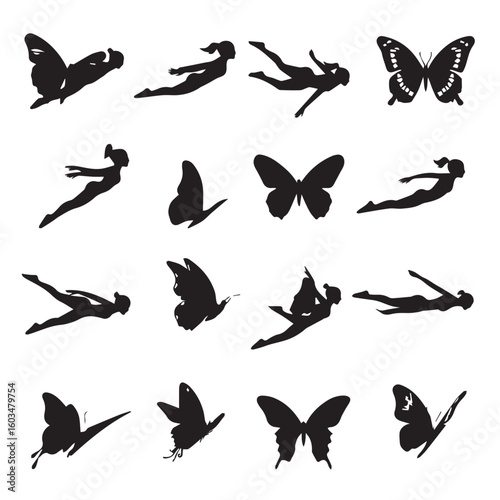vector illustration of butterfly swimmer silhouette set, Black & White silhouette set