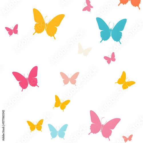 Vector illustration of colorful butterflies flying in the air, simple flat style, white background, cute cartoon design, simple lines