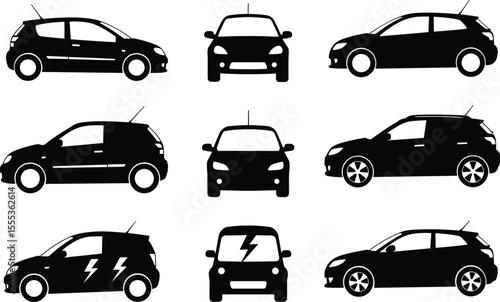 Vector illustration of electric and regular car silhouettes, front and side views, black vehicle icons, modern automotive design collection