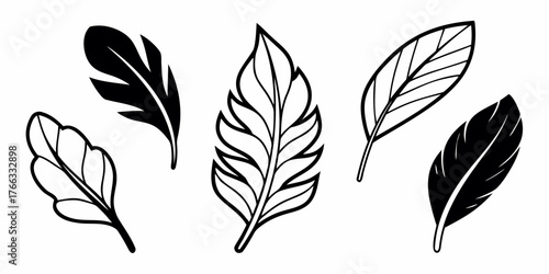 Vector illustration of five stylized leaves in black and white with varying shapes and line details