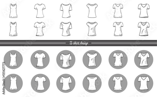 Vector illustration of line art style and realistic women's t-shirt without mesh. Front view. Set t-shirts mockup.